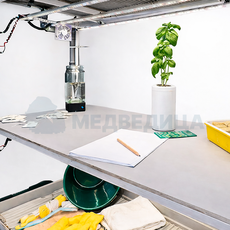 Конструкция практикума выполнена на базе металлического каркаса с антикоррозийной защитой и регулируемыми опорами, что позволяет размещать оборудование на поверхностях с различным уровнем. Рабочая зона включает два уровня, высота которых изменяется без снятия элементов с растениями.