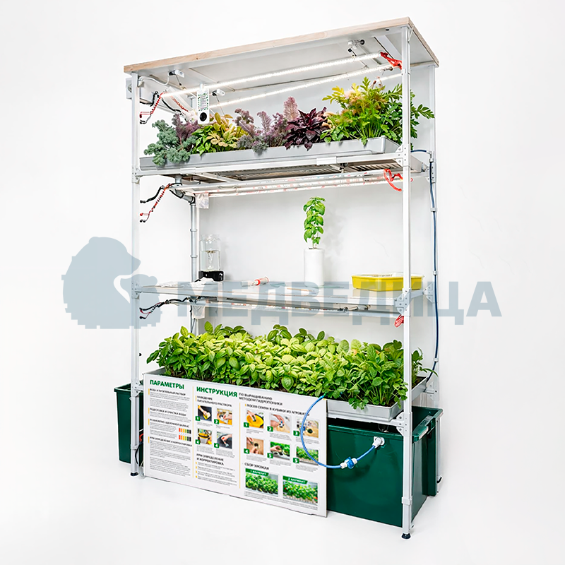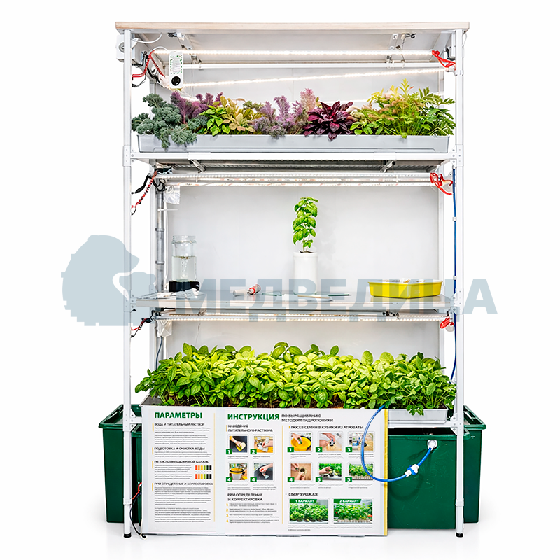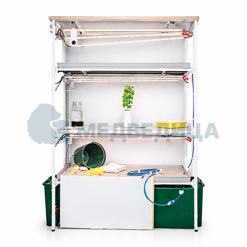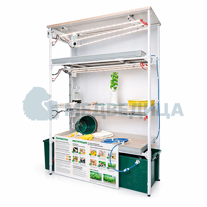 В комплект входит ёмкость для подачи воды объёмом 60 литров, а также прибор для контроля температуры и влажности окружающей среды. Методические материалы и инструкции доступны в цифровом формате через QR-доступ.