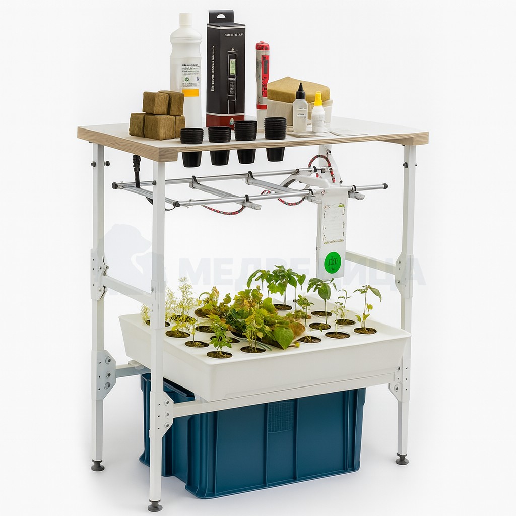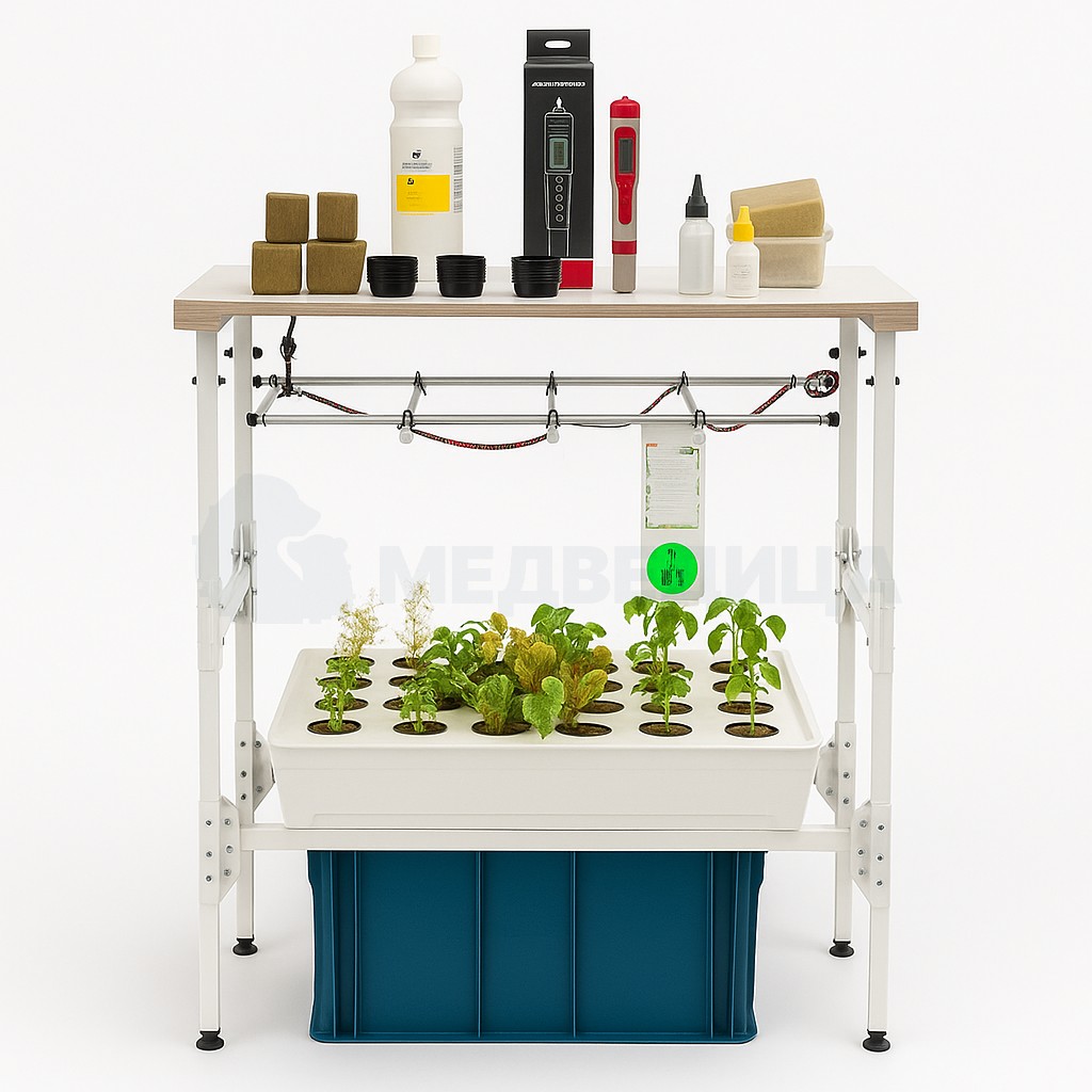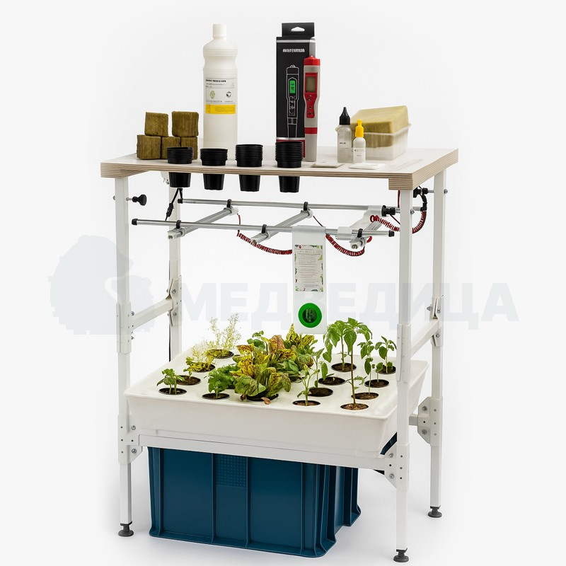 Установка имеет трёхъярусное исполнение с общей площадью выращивания около 0,75 м², что позволяет одновременно проводить несколько опытов. Многоуровневая схема удобна для работы учебной группы и сравнения условий выращивания.