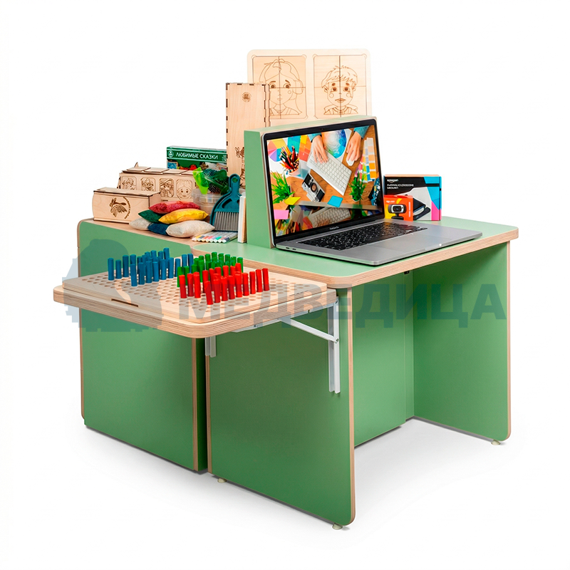 Конструкция стола продумана так, чтобы в рамках одного рабочего места можно было сочетать разные форматы работы. Здесь удобно проводить индивидуальные занятия, встречи с небольшой группой детей, а также спокойные игровые и развивающие сессии.