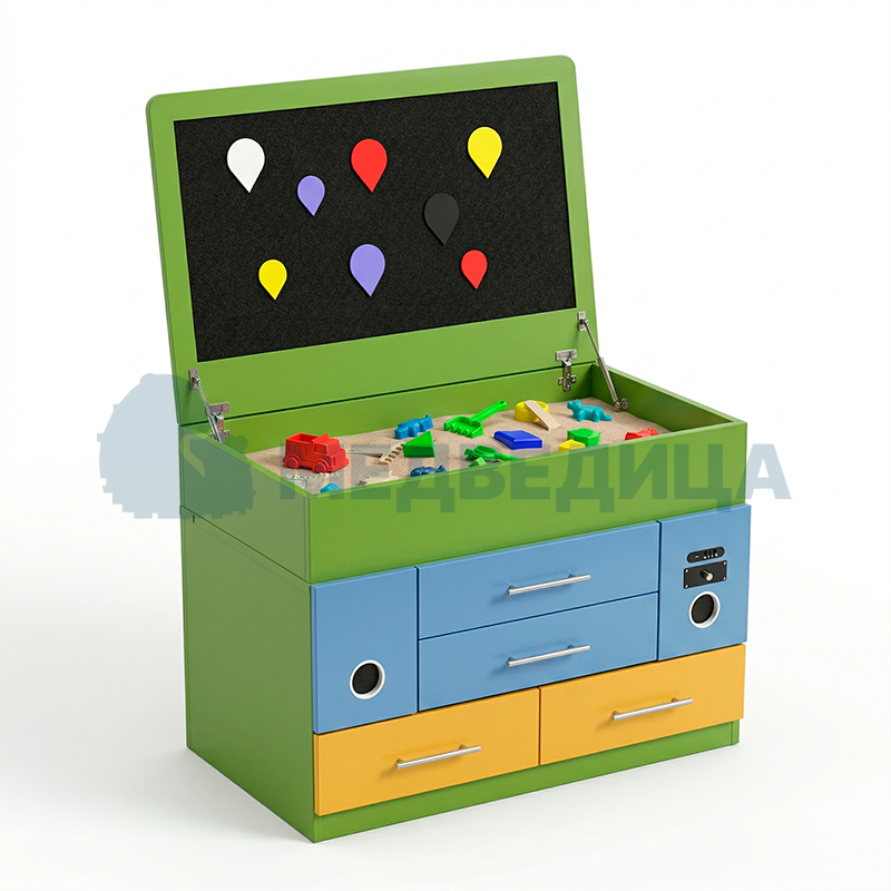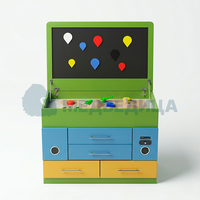 В составе комплекса используется песочный планшет с подсветкой. Он применяется в занятиях для эмоциональной разгрузки, развития воображения и тактильной чувствительности.